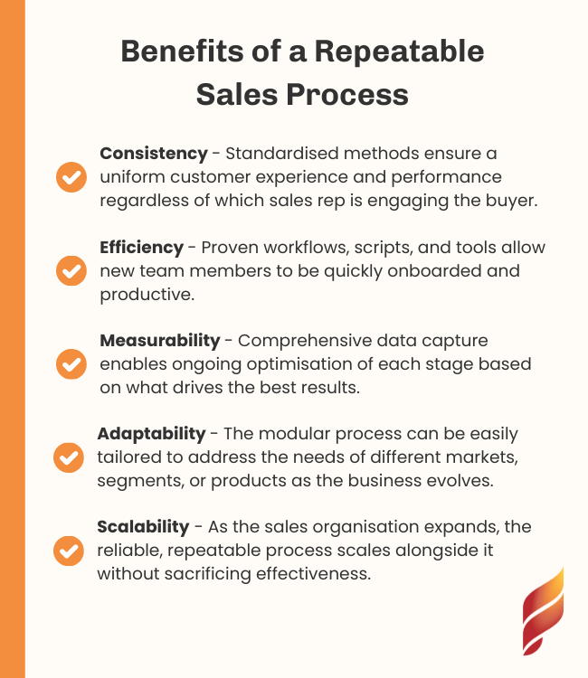 The final, and arguably most important, stage in a scalable sales strategy is to repeat the well-defined sales process continuously across your organisation. By establishing a repeatable approach to your sales process, you create a reliable sales engine that new and existing sales people can latch onto generating a growth strategy that is well-informed and more predictable.